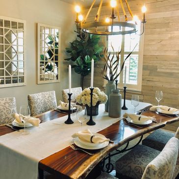 Our dining room with a wood wall, chandelier, the custom table my husband insisted on...somehow she brought it all together to be perfect!